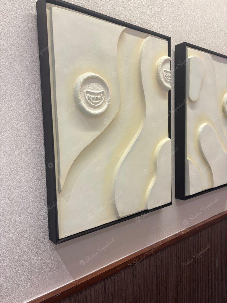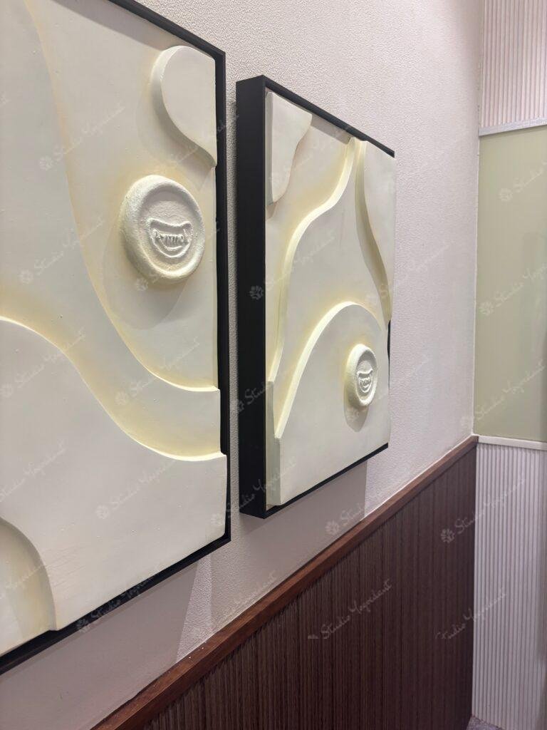 This installation represents Anmol’s forward-thinking spirit — “thinking beyond the box.” Each frame symbolizes imagination and progression, using biscuit-inspired contours to form abstract geometries. Installed in the small conference room, the design adds a creative and thought-provoking layer to the space.